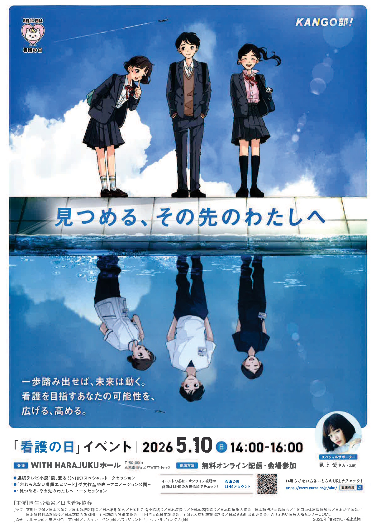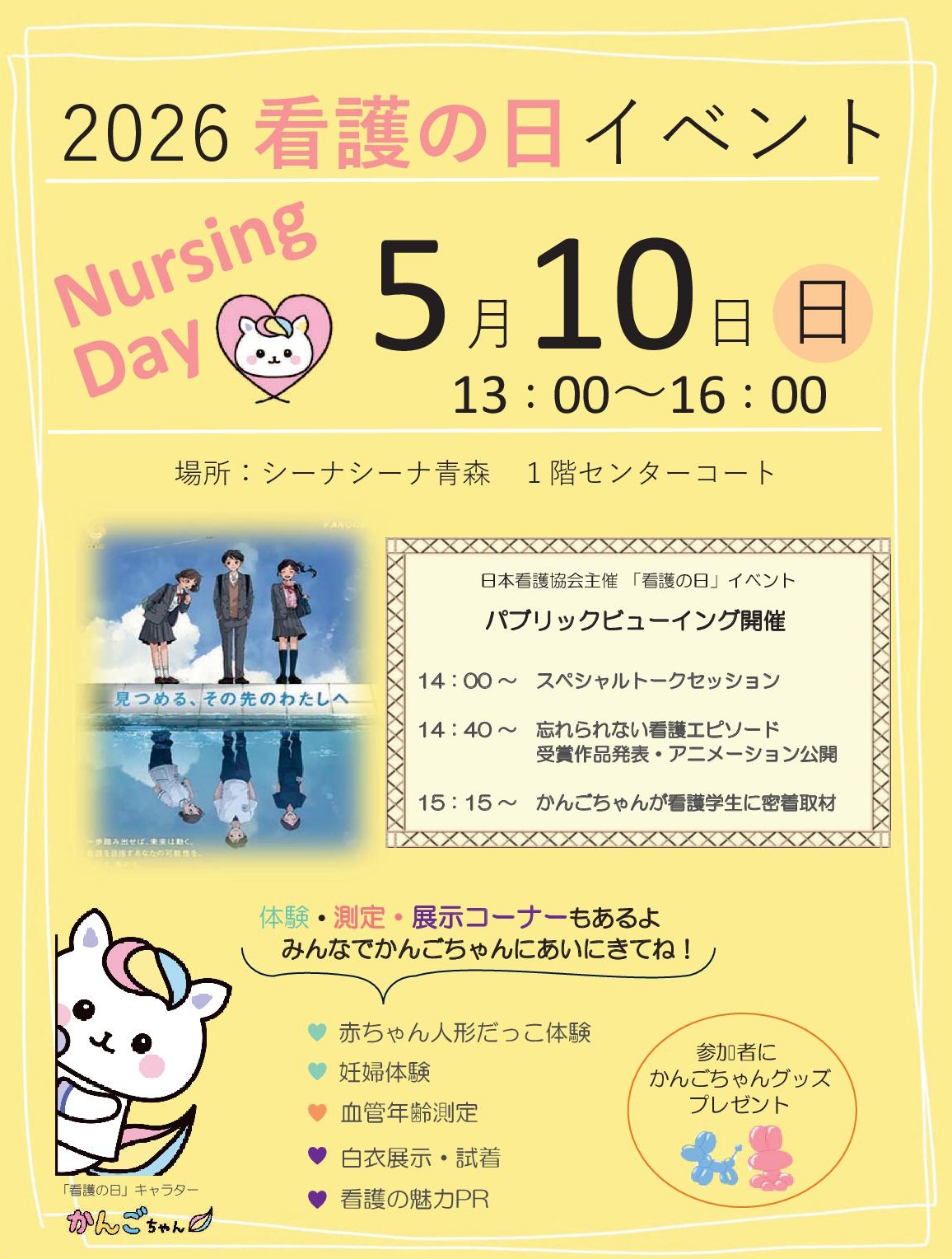 令和8年度看護の日・看護週間事業 2026看護の日イベントを開催します! 開催日時:令和8年5月10日(日)13:00~16:00 場 所:シーナシーナ青森 1階センターコート 2026年度は5月10日(日)から16日(土)が「看護週間」となります。 今年度のテーマは「見つめる、その先のわたしへ」です。 令和7年度看護の日・看護週間事業 令和7年度の看護の日・看護週間事業についてはこちらから 令和6年度看護の日・看護週間事業 令和6年度の看護の日・看護週間事業についてはこちらから 令和5年度看護の日・看護週間事業 令和5年度の看護の日・看護週間事業についてはこちらから 令和4年度看護の日・看護週間事業 令和4年度の看護の日・看護週間事業についてはこちらから