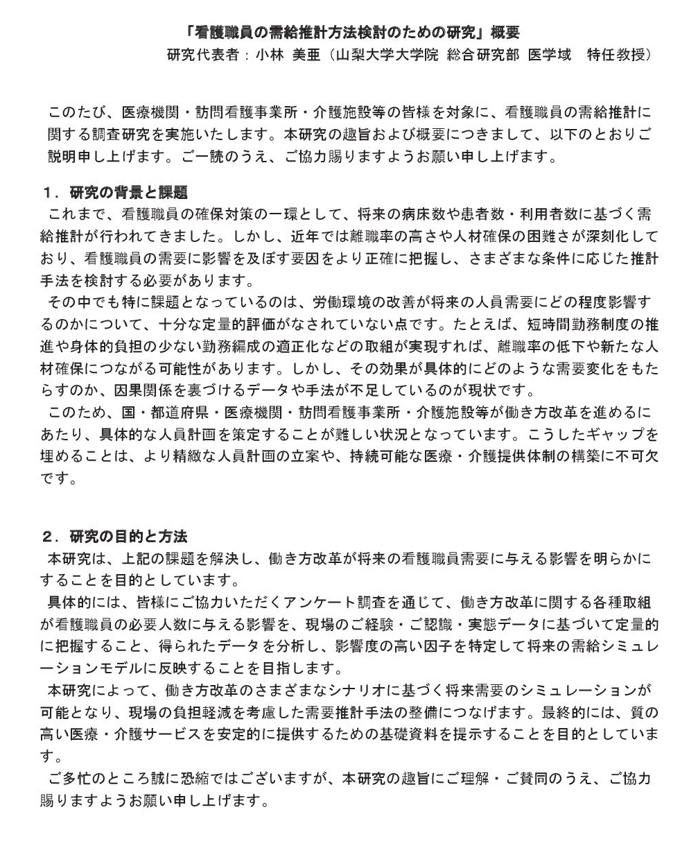つきましては、ご多忙のところ誠に恐縮ではございますが、本調査の趣旨をご理解いただき、医療機関や訪問看護事業所、介護福祉施設等、看護職員が働く医療機関・施設において、調査にご協力いただきますようお願い申し上げます。