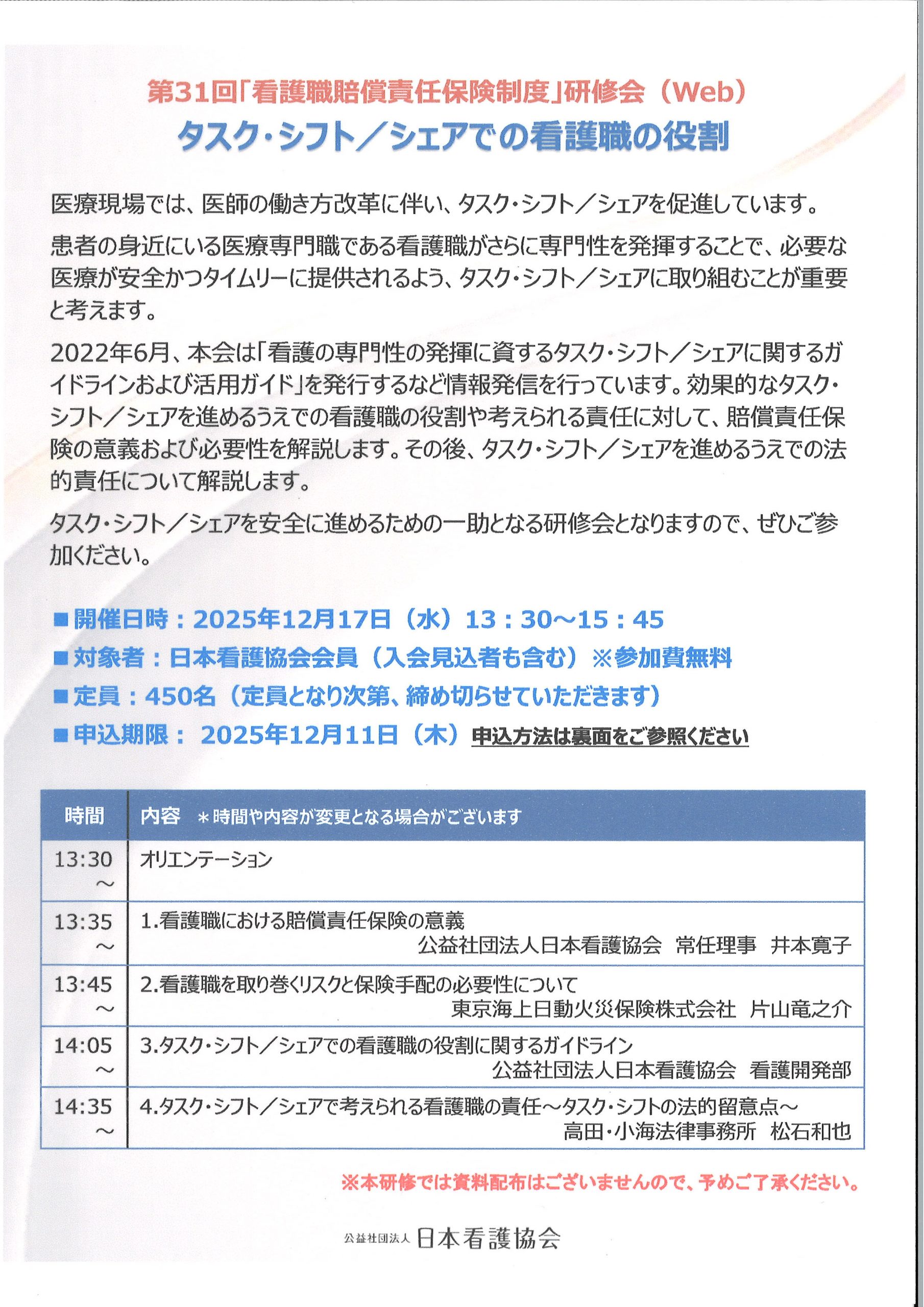 日本看護協会では第31回「看護職賠償責任保険制度」研修会(web)【タスク・シフト/シェアでの看護職の役割】を12月17日に開催します。詳しくは下記チラシをご参照ください。