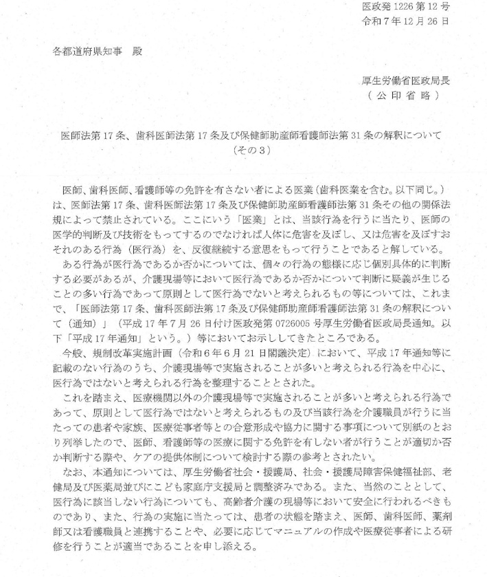 厚生労働省医政局から「医師法第17条、歯科医師法第17条及び保健師助産師看護師法第31条の解釈」についての周知です