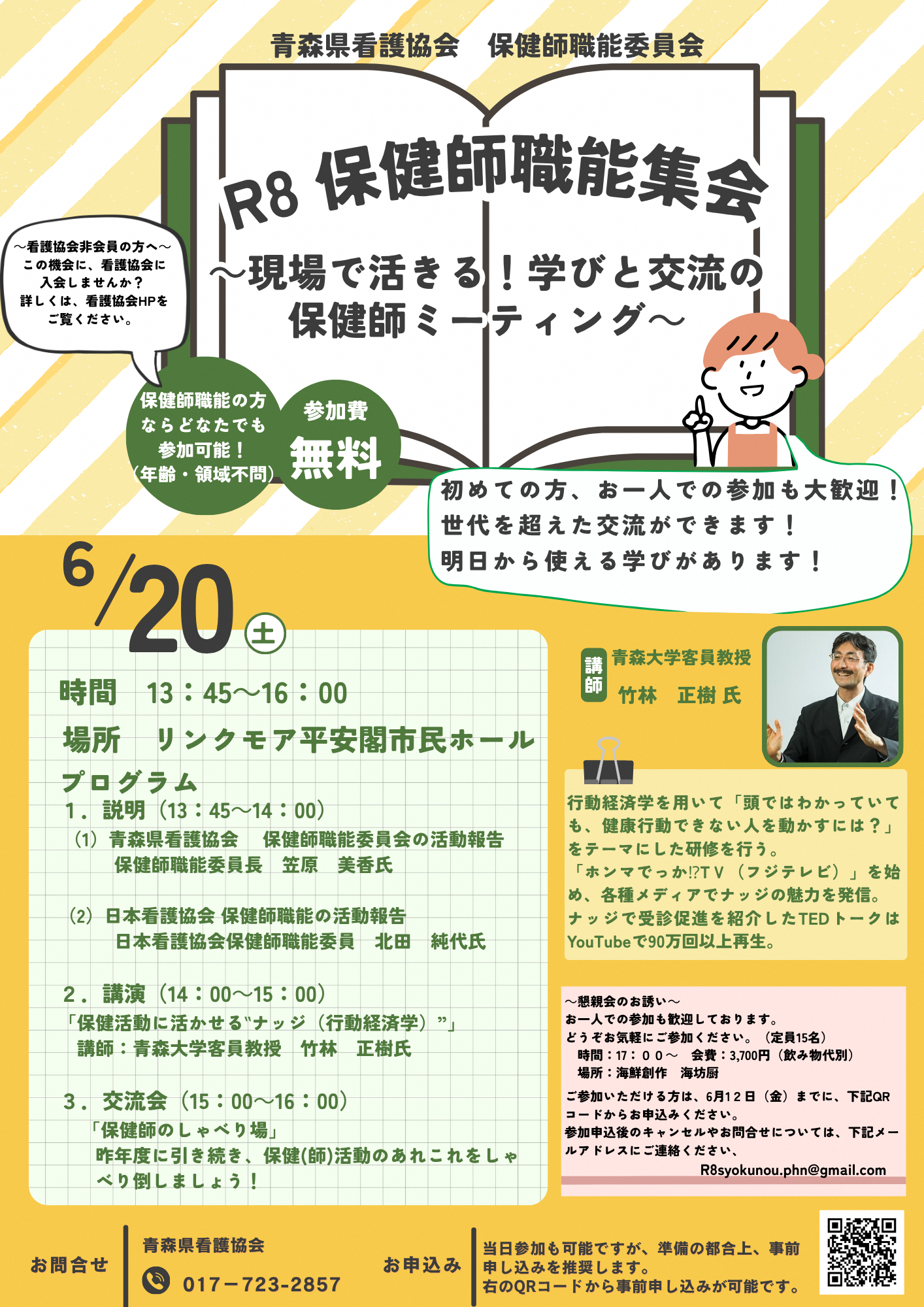今年度は「保健活動に活かせる”ナッジ(行動経済学)”」と題し、青森大学の竹林客員教授にお越しいただきます